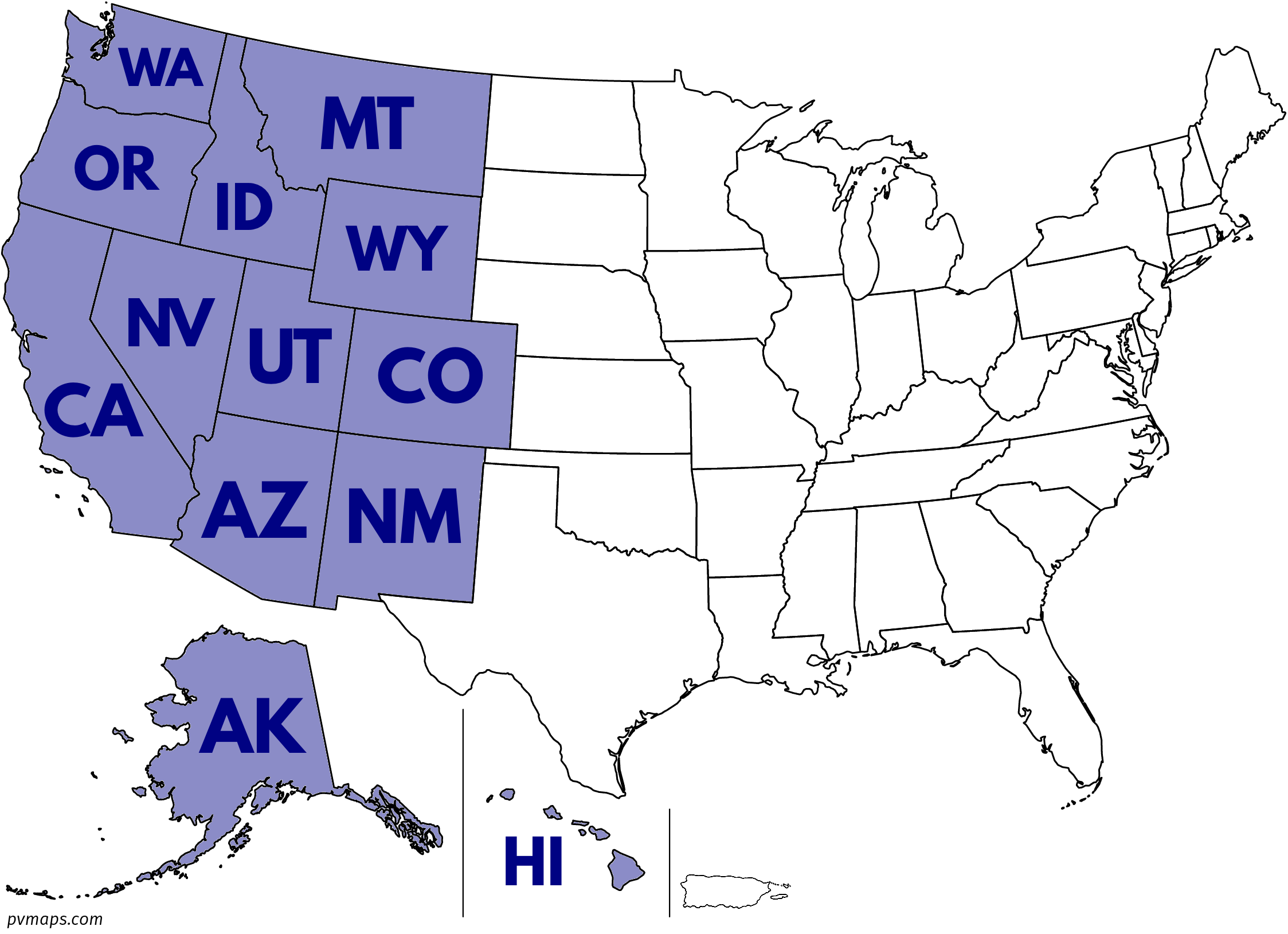 Alaska, California, Hawaii, Idaho, Montana, Nevada, Oregon, Utah, Washington, Arizona, Colorado, New Mexico, and Wyoming