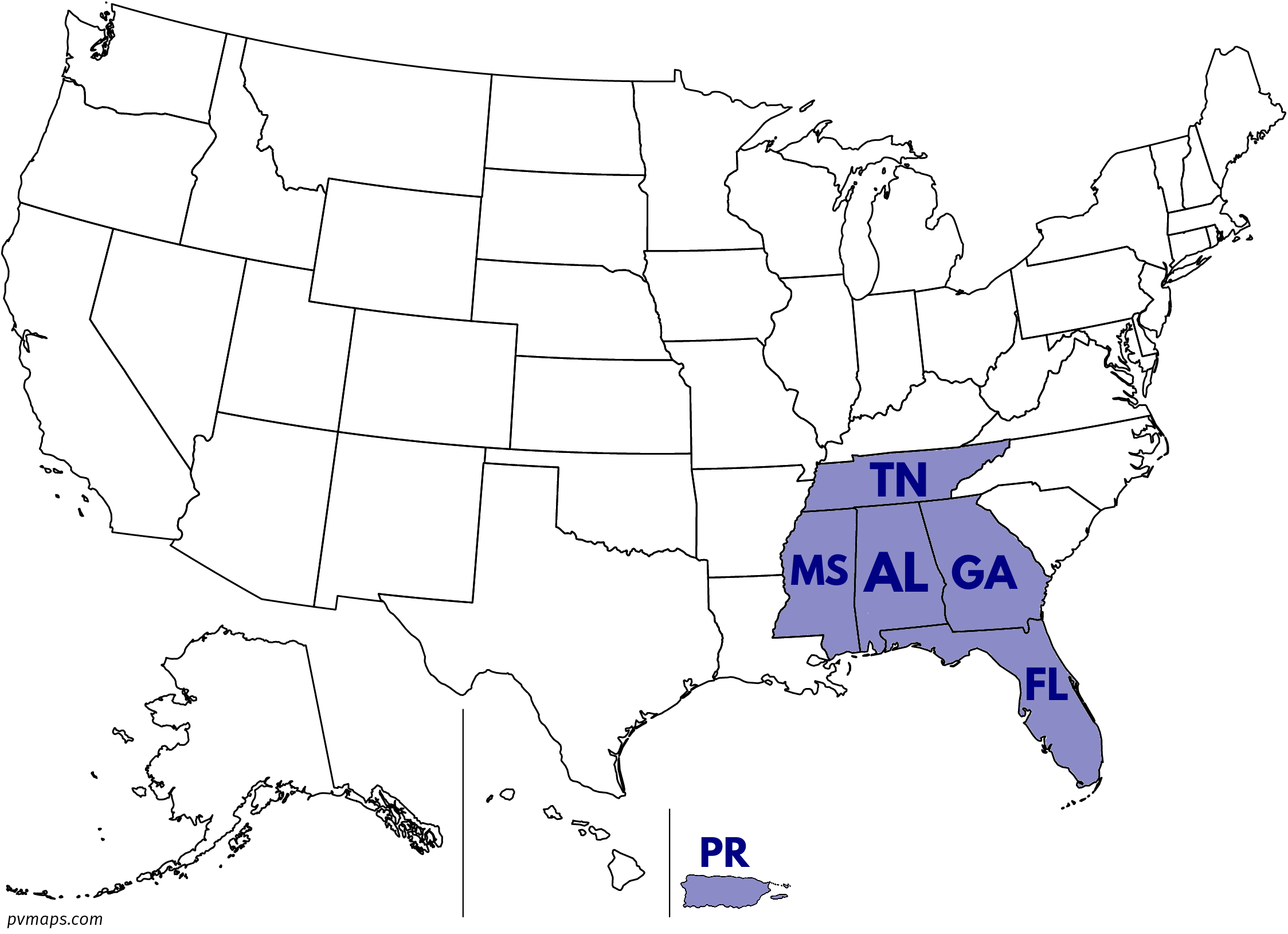 Alabama, Florida, Georgia, Mississippi, Puerto Rico, Tennessee